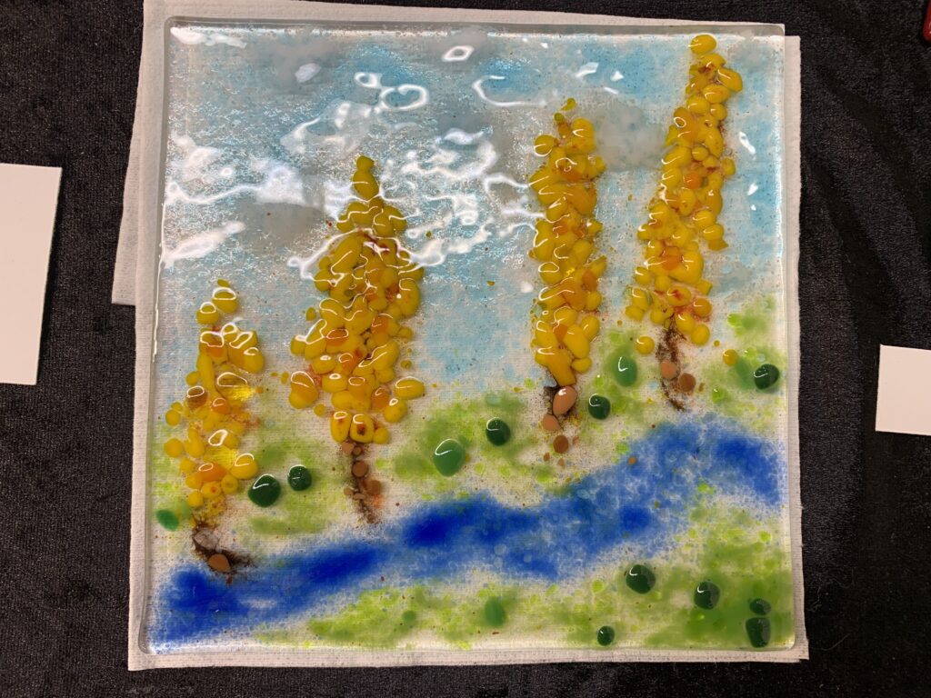 Delivered in 2 sessions, first use live plants fused between 6mm clear float glass in order to leave a “fossil-like” ghost image in the glass. After break, have fun using glass frit and powders to create a scene of your choice on clear glass. Your pieces will be fired for you to collect later.
